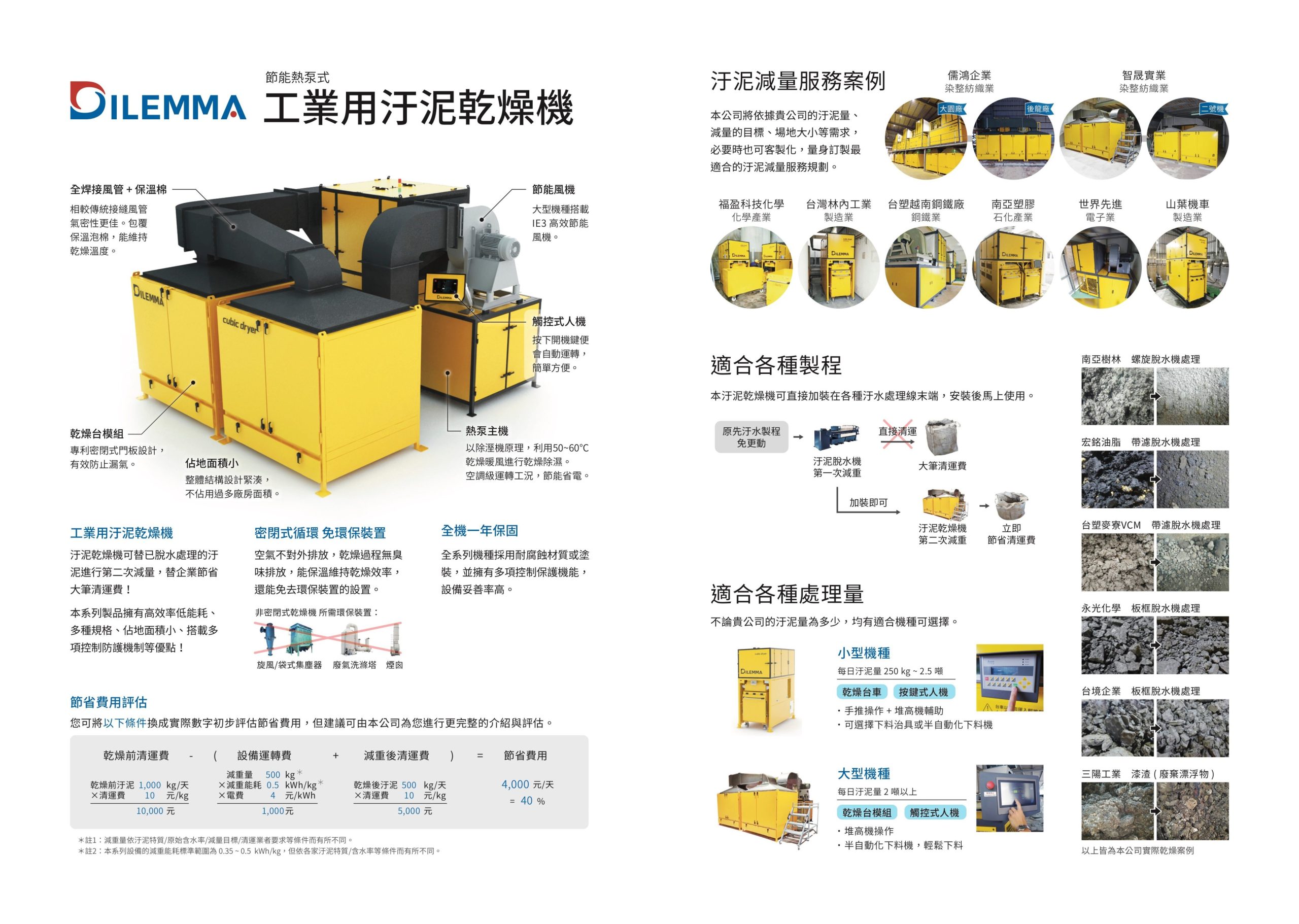 Sau khi bùn được làm khô, khối lượng trở nên nhỏ hơn. Phí xử lý và giải quyết mặt bằng chứa bùn mà các nhà sản xuất cần phải trả cũng được giảm. Tùy thuộc vào điều kiện bùn thải, sau khi trừ chi phí vận hàng của thiết bị, tiết kiệm khoảng 30-50% phí xử lý bùn thải.